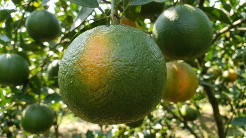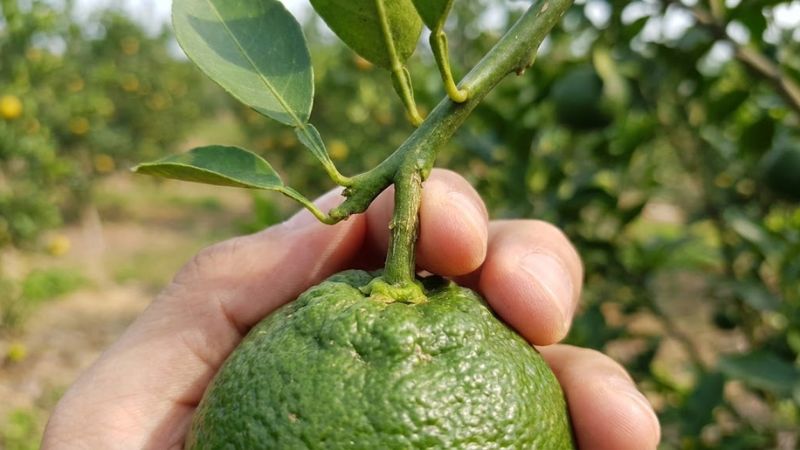 Quả cam sành tốt có màu xanh đậm với độ bóng tự nhiên, không quá sáng hay quá tối. Phần đáy hơi chuyển vàng trong khi thân và đỉnh vẫn xanh – đó mới là cam chín cây. Những quả vàng đều khắp vỏ thường bị ngâm hóa chất để ép chín.