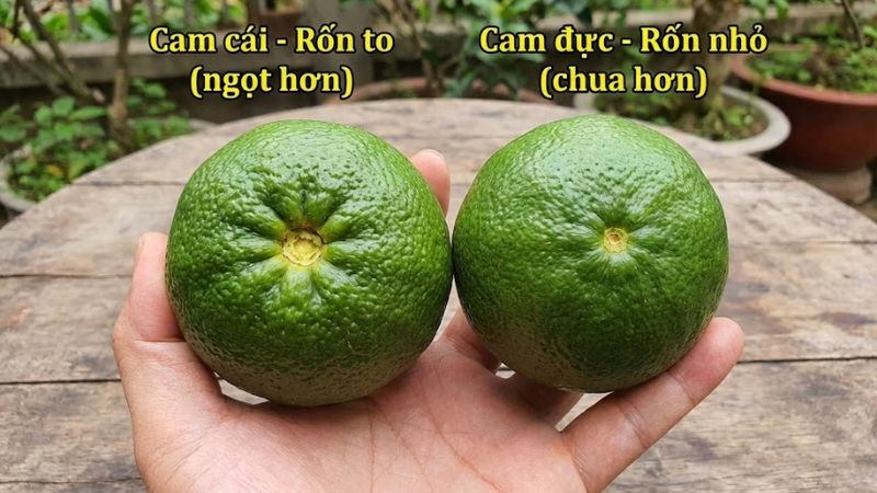 - Phần rốn (đáy quả): Đây là bí quyết ít người biết. Rốn cam to (thường gọi là cam cái) sẽ tích lũy đường nhiều hơn nên ngọt hơn. Rốn cam nhỏ (cam đực) thường chua hơn. Hãy ưu tiên chọn quả có rốn hơi lõm và to nhé.