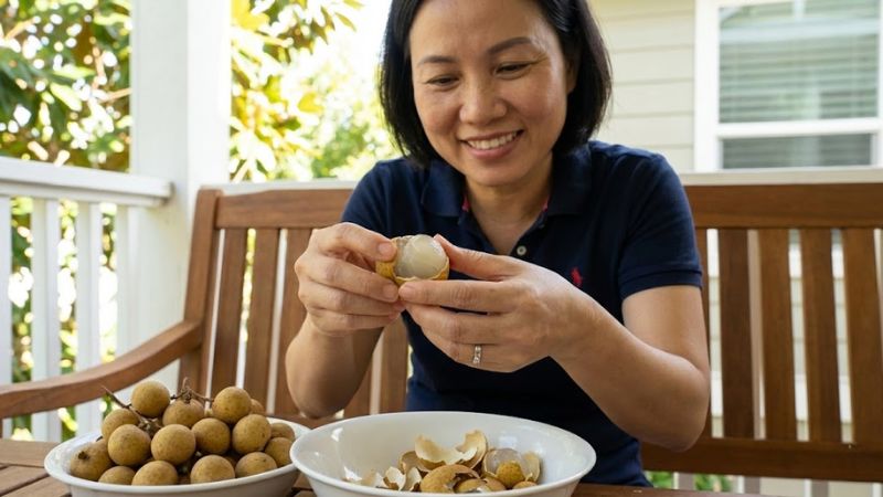 - Lắc nhẹ: Cầm vài trái nhãn lên gần tai và lắc nhẹ. Nếu không nghe thấy tiếng động, cảm giác nặng tay, đầy đặn thì đó là nhãn tươi, cơm dày. Nếu nghe tiếng lạo xạo bên trong, chứng tỏ cơm đã bị khô, co lại và tách khỏi vỏ, ăn sẽ rất xơ và không ngon.