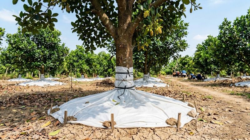 Phủ bạt nilong quanh gốc cây mít thái để siết nước