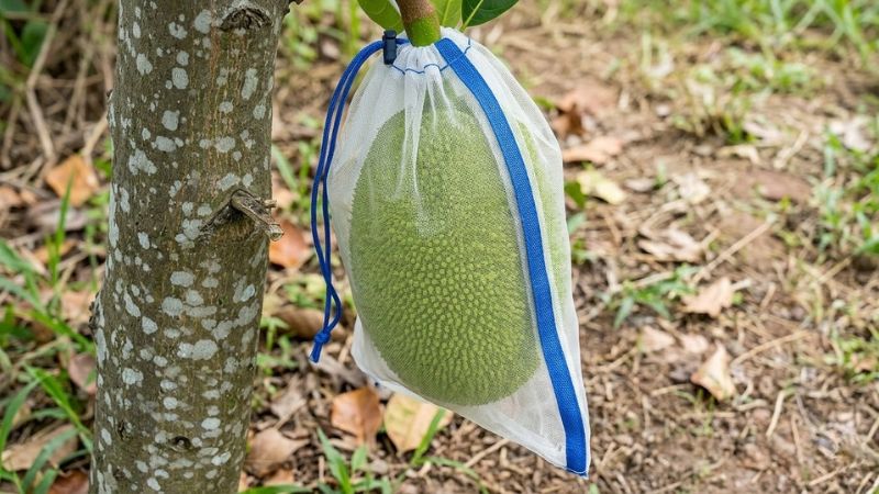 Trái mít thái non đang được bọc trong túi lưới chuyên dụng