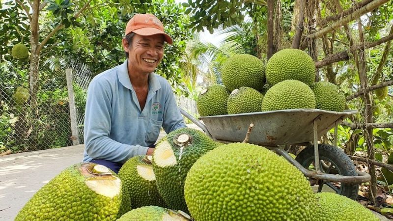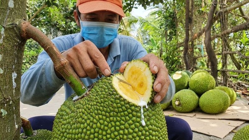 Nông dân miền Tây đang tươi cười thu hoạch mít Thái tại vườn