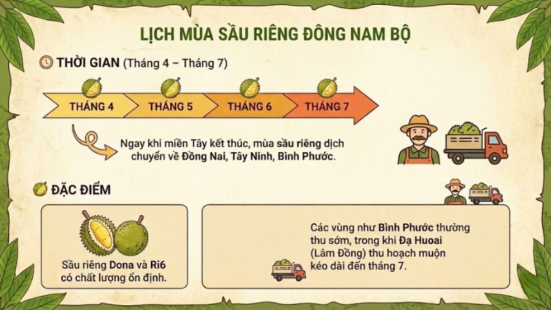 - Thời gian (Tháng 4 – Tháng 7): Ngay khi miền Tây kết thúc, mùa sầu riêng dịch chuyển về Đồng Nai, Tây Ninh, Bình Phước.