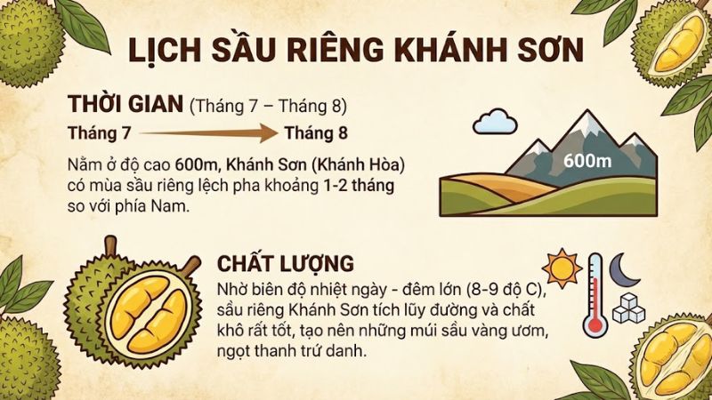 - Thời gian (Tháng 7 – Tháng 8): Nằm ở độ cao 600m, Khánh Sơn (Khánh Hòa) có mùa sầu riêng lệch pha khoảng 1-2 tháng so với phía Nam.