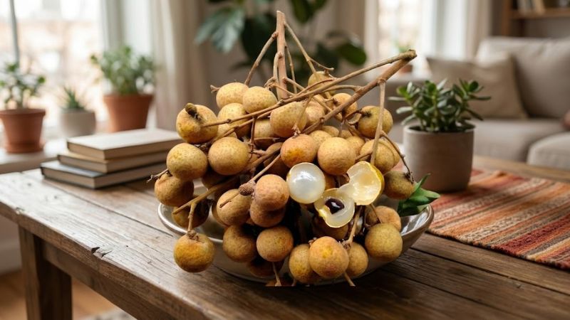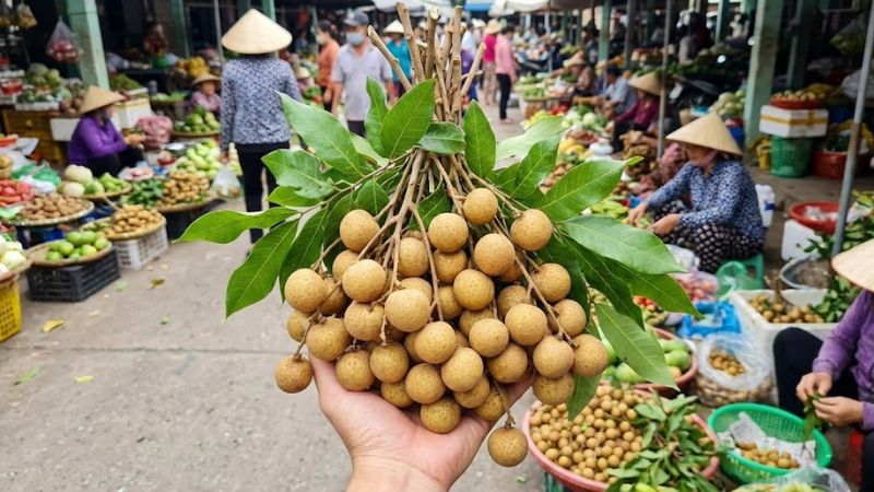 Khi chọn mua, nên ưu tiên những chùm nhãn còn cành, lá xanh, cuống tươi và ẩm. Quả to đều, vỏ vàng đậm, sần nhẹ, có thể còn lớp bụi phấn mỏng bên ngoài là dấu hiệu của nhãn tươi, chưa qua xử lý hóa chất.