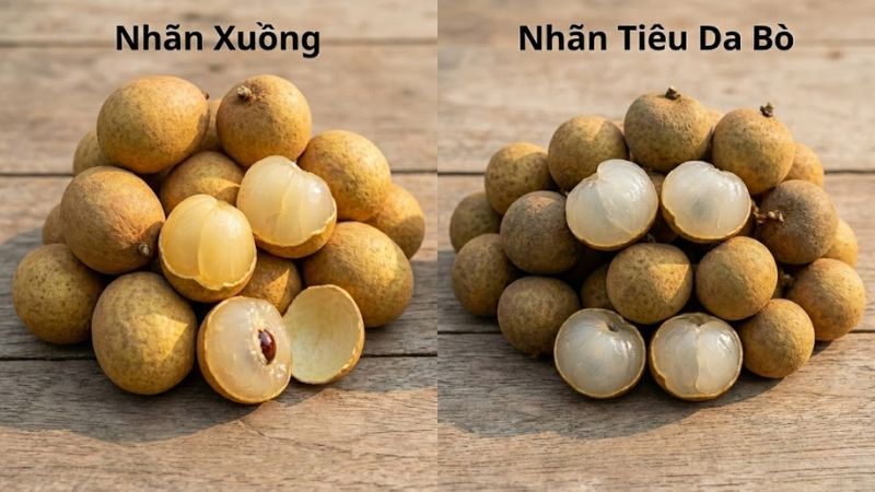 Phân biệt nhãn xuồng (trái) và nhãn tiêu da bò (phải)